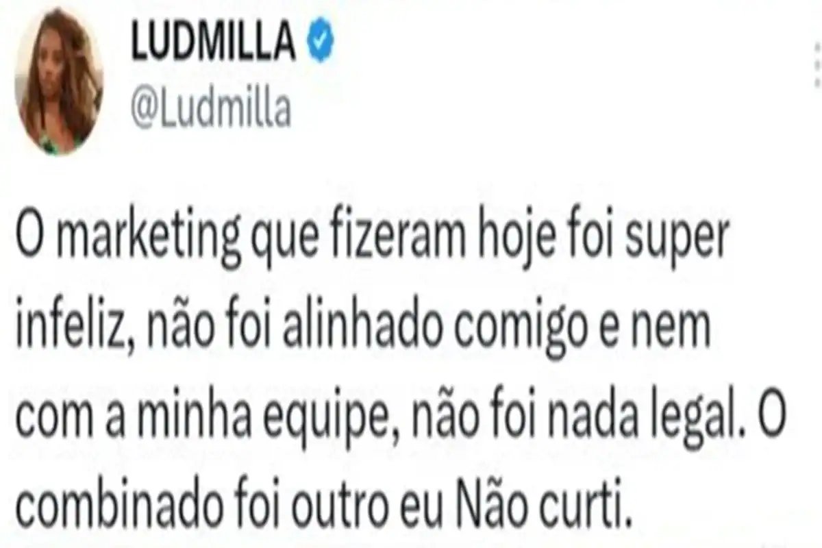 “O marketing que fizeram hoje foi muito infeliz, não foi alinhado comigo nem com a minha equipe, não foi nada legal. O combinado era outro. Eu não curti“, declarou Ludmilla.