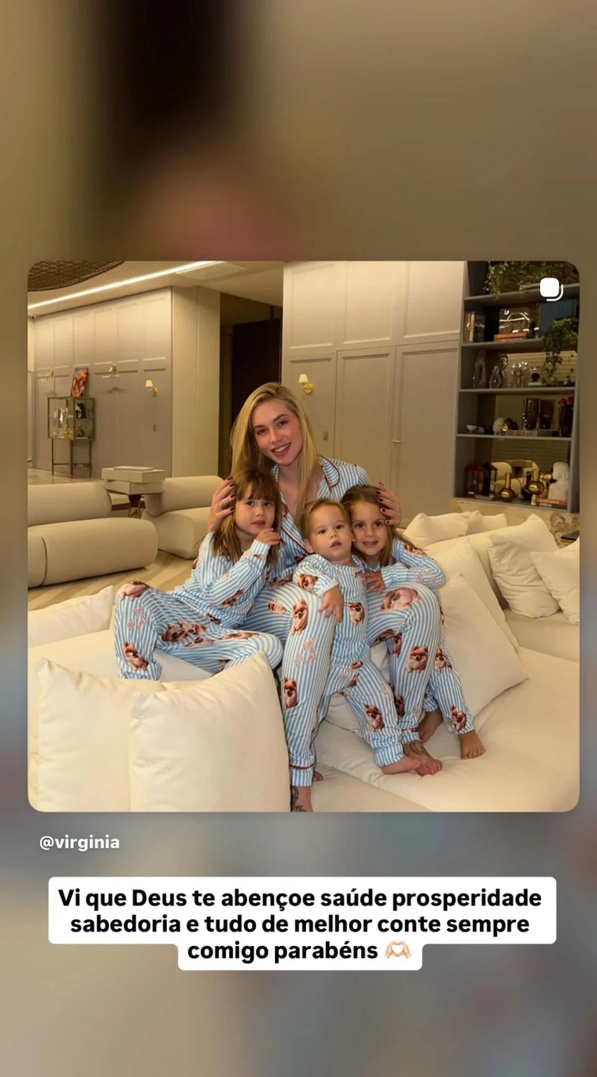 Nos stories do Instagram, o filho de Leonardo publicou uma foto de Virginia ao lado dos filhos, Maria Alice, Maria Flor e José Leonardo, e desejou parabéns à ex-esposa: “Vi, que Deus te abençoe saúde, prosperidade, sabedoria e tudo de melhor. Conte sempre comigo parabéns”, escreveu o músico.