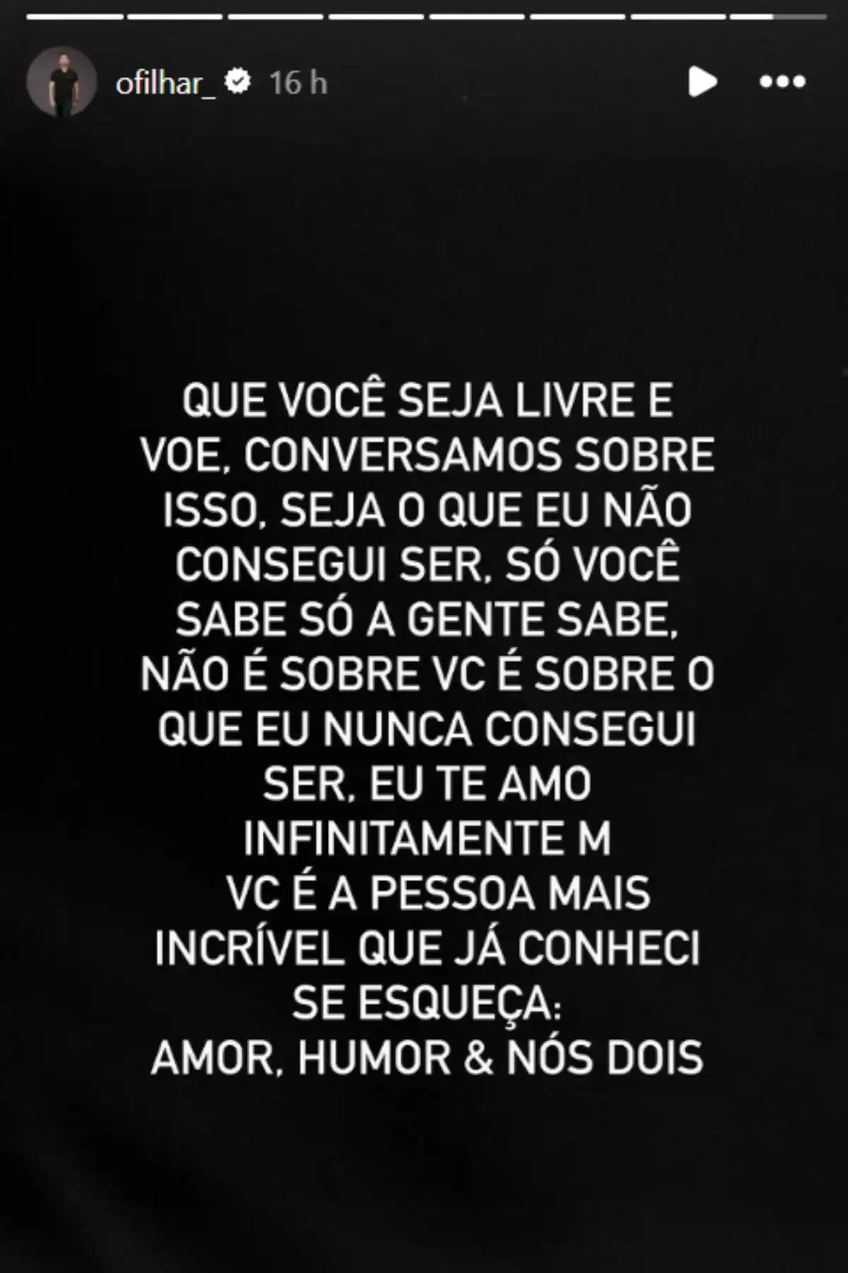 Em um dos stories, ele escreveu: “Que você seja livre e voe. Conversamos sobre isso. Seja o que eu não consegui ser. Só você sabe, só a gente sabe. Não é sobre você, é sobre o que eu nunca consegui ser. Eu te amo infinitamente. Você é a pessoa mais incrível que já conheci. Se esqueça: amor, humor & nós dois”, disse.