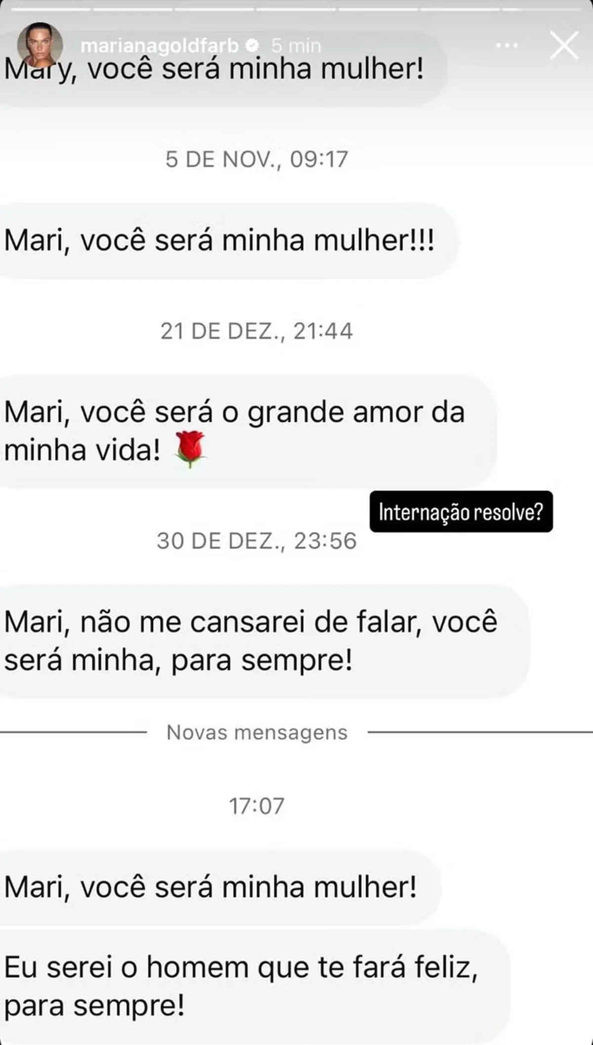 O print da tentativa de conversa revela os textos enviados pelo homem desde o final de 2025 até a última segunda-feira (6/4). Mesmo sem resposta, ele continuou escrevendo em pelo menos quatro ocasiões: “Mari, você será minha mulher!”; “Mari, você será o grande amor da minha vida”; “Não me cansarei de falar: você será minha para sempre” e “Eu serei o homem que te fará feliz para sempre”.