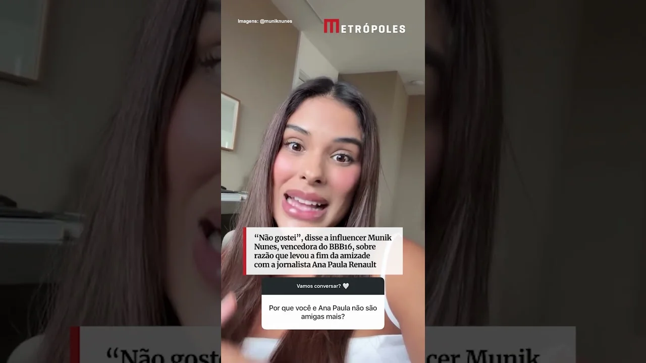 A influenciadora Munik Nunes utilizou suas redes sociais nesta terça-feira (7/4) para esclarecer o motivo do término de sua amizade com Ana Paula Renault. Ambas participaram do BBB16, da TV Globo, onde Munik saiu vencedora. Nos stories, ela revelou que uma atitude da jornalista a desagradou, levando-a a se afastar.