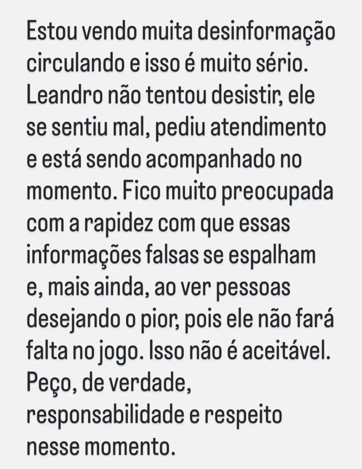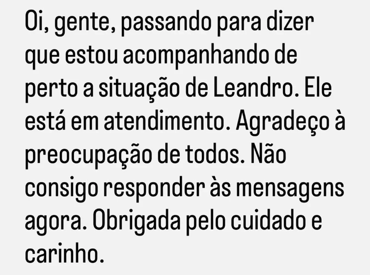 “Oi, gente, passando para dizer que estou acompanhando de perto a situação de Leandro. Ele está em atendimento. Agradeço à preocupação de todos. Não consigo responder às mensagens agora. Obrigada pelo cuidado e carinho. Estou vendo muita desinformação circulando e isso é muito sério”, afirmou.