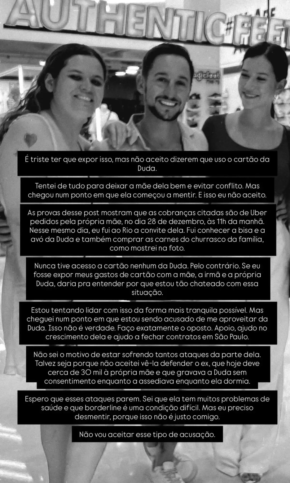 No fim, ele mandou um recado: “Ela tem o direito total de fazer o que quiser da vida dela, gente. Isso me deixou chateado e é um direito meu. E tudo bem. Por isso postei. Amo muito a Duda, queria que as coisas tivessem sido diferentes. Não tenho nada a esconder”, finalizou.