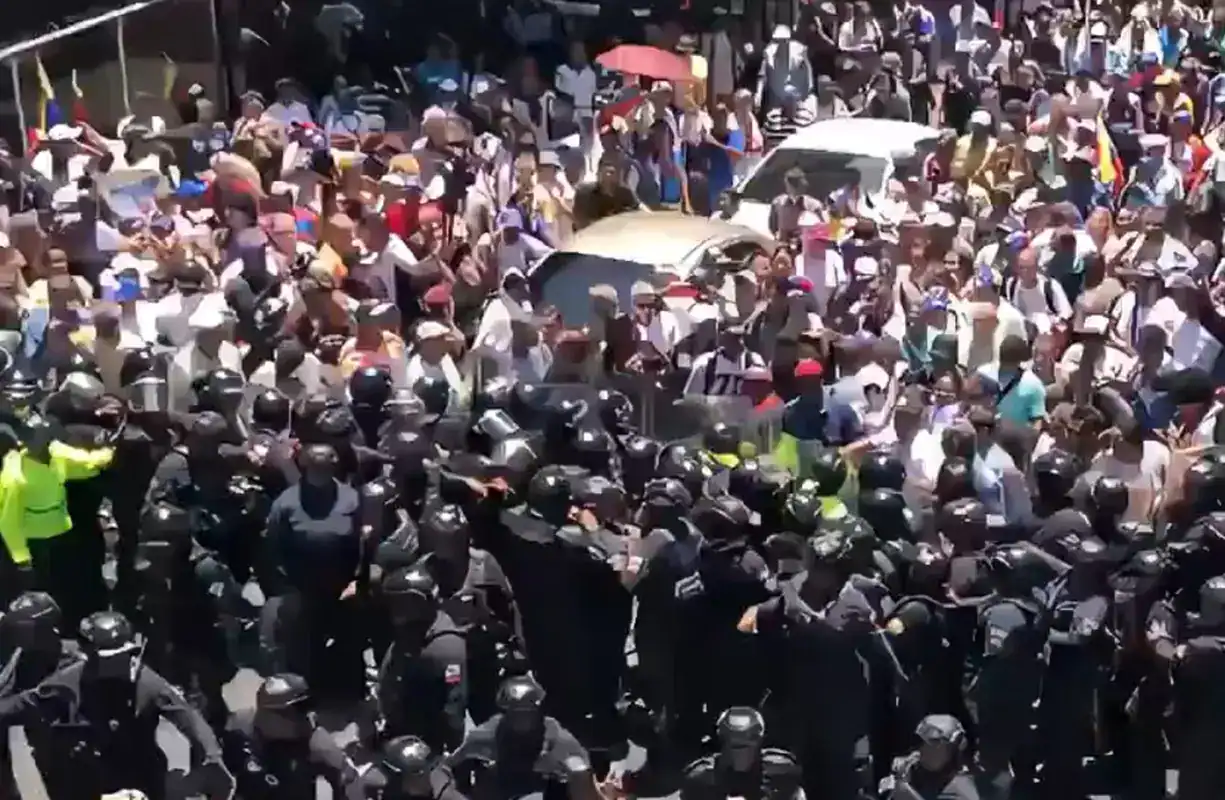 Imagens divulgadas na rede social X mostram a polícia de choque, equipada com escudos, impedindo a passagem dos manifestantes que se dirigiam ao Palácio de Miraflores. Segundo informações da AFP, os agentes usaram gás lacrimogêneo para dispersar o grupo.