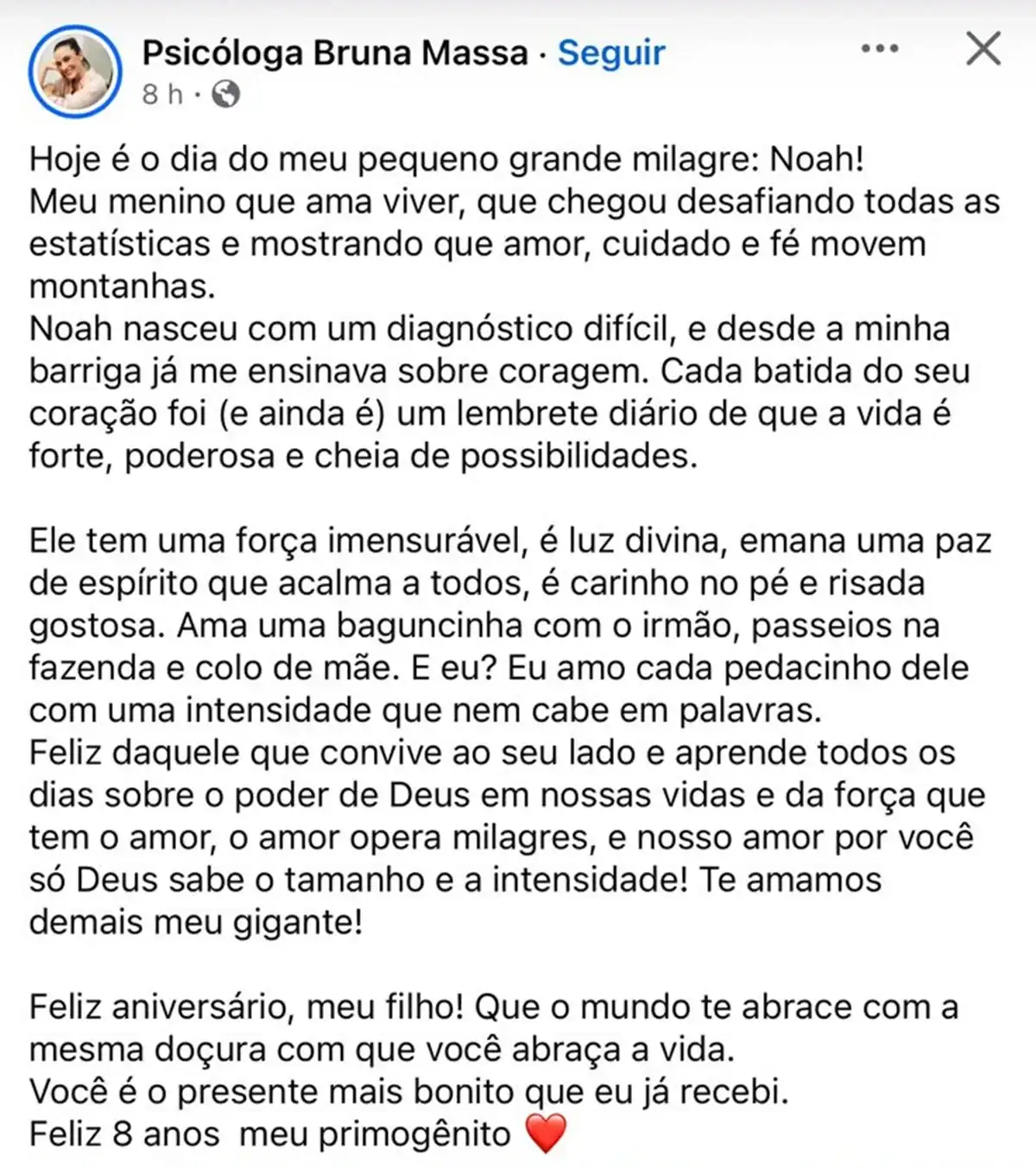“Hoje é o dia do meu pequeno grande milagre: Noah! Meu menino que ama viver, que chegou desafiando todas as estatísticas e mostrando que amor, cuidado e fé movem montanhas”, começou ela.