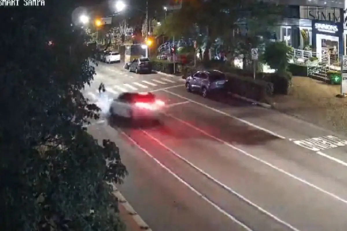 Outra câmera mais adiante na avenida mostrou o carro deixando o local em alta velocidade, comprovando que o motorista não prestou socorro à vítima após o acidente.