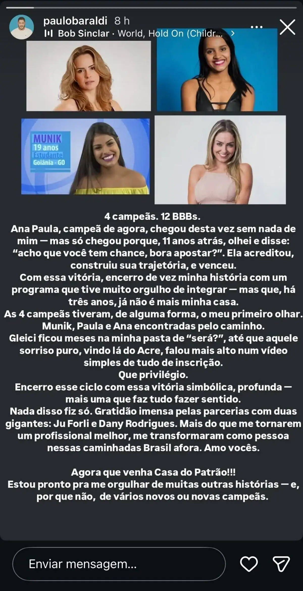 “4 campeãs. 12 BBBs. Ana Paula, campeã de agora, chegou desta vez sem nada de mim. Mas só chegou porque, 11 anos atrás, olhei e disse: ‘Acho que você tem chance, bora apostar?’”, lembrou Paulo Baraldi.
