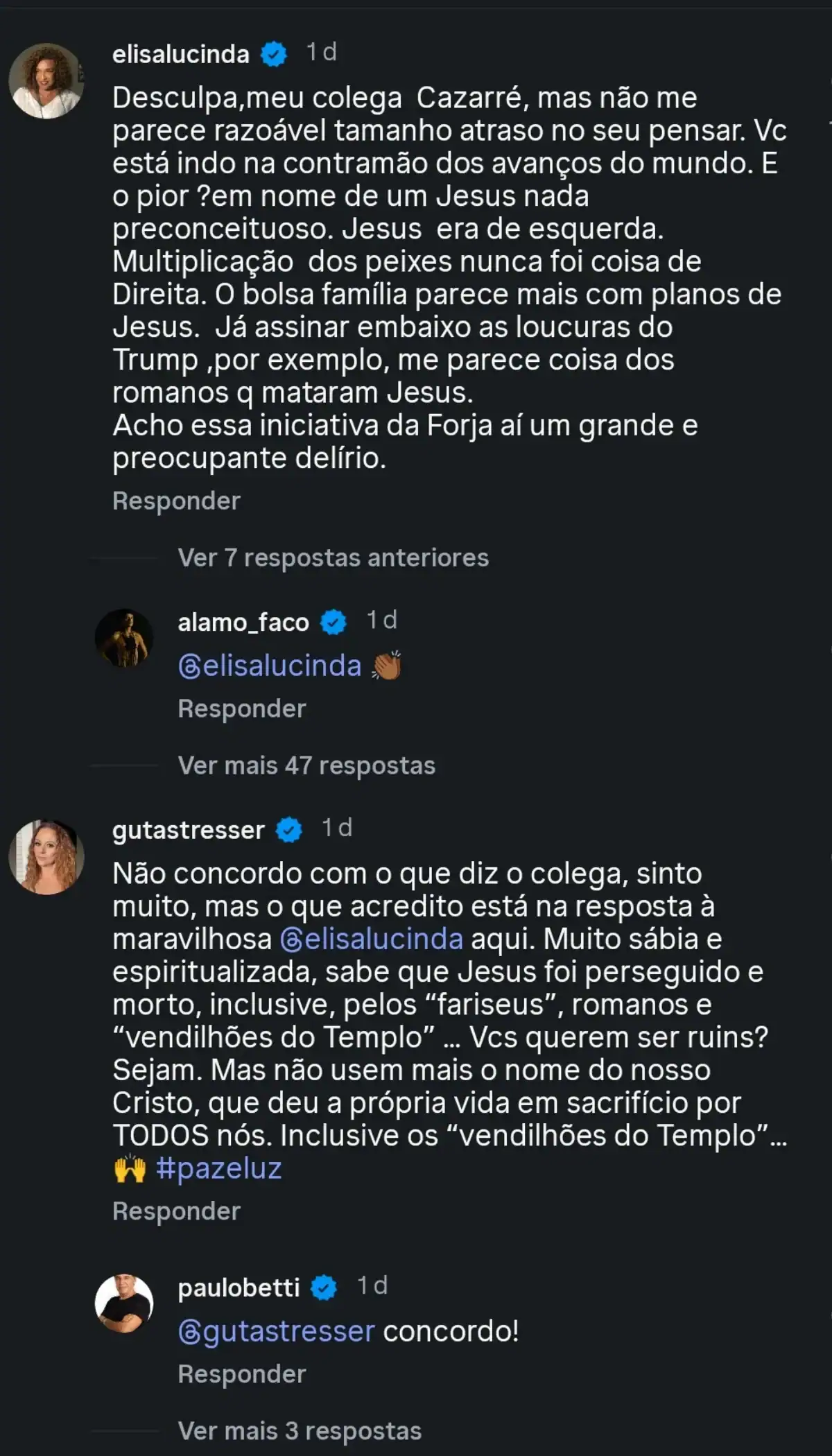 “Desculpa, meu colega Cazarré, mas não me parece razoável tamanho atraso no seu pensar. Vc está indo na contramão dos avanços do mundo. E o pior? Em nome de um Jesus nada preconceituoso. Jesus era de esquerda. Multiplicação dos peixes nunca foi coisa de direita. O Bolsa Família parece mais com planos de Jesus. Já assinar embaixo as loucuras do Trump, por exemplo, me parece coisa dos romanos q mataram Jesus. Acho essa iniciativa da Forja aí um grande e preocupante delírio”, lamentou a atriz.