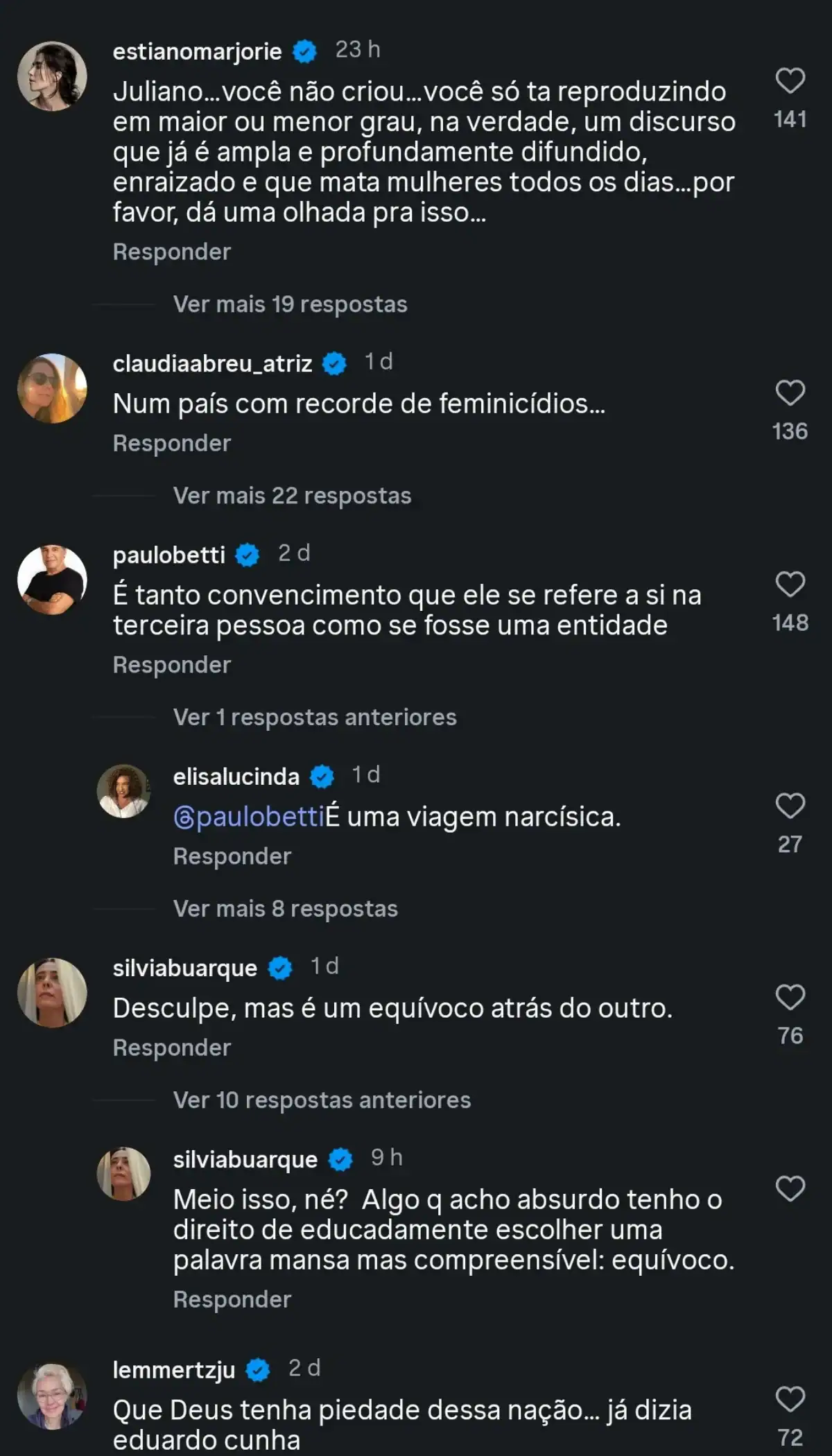 “Juliano… você não criou… você só tá reproduzindo, em maior ou menor grau, na verdade, um discurso que já é ampla e profundamente difundido, enraizado e que mata mulheres todos os dias. Por favor, dá uma olhada pra isso”, escreveu.