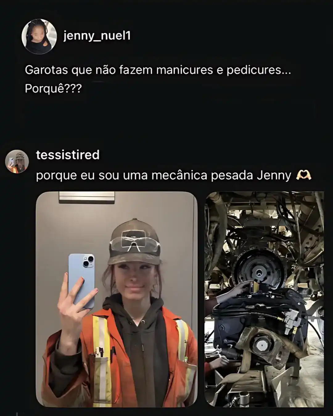 Nos comentários, mulheres começaram a responder diretamente à autora, explicando que, em muitos casos, a ausência desse tipo de cuidado está ligada às exigências do trabalho. Uma das respostas destacou a rotina na área da saúde ao afirmar: “Porque sou uma terapeuta respiratória registada Jenny”. Outra usuária, que atua em situações de emergência, também respondeu: “Porque sou paramédica/bombeira, Jenny.”