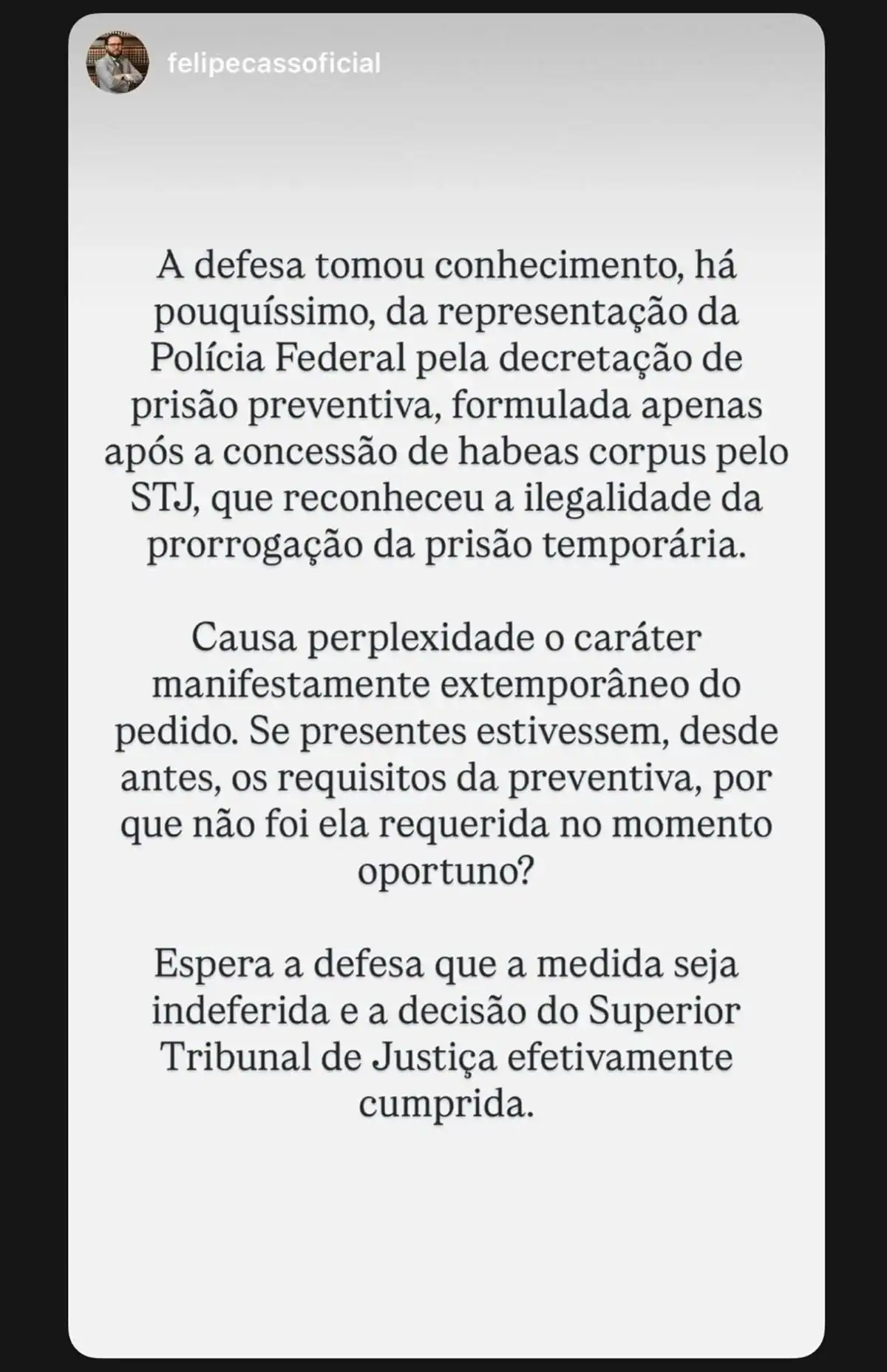 “A defesa tomou conhecimento, há pouquíssimo, da representação da Polícia Federal pela decretação de prisão preventiva, formulada apenas após a concessão de habeas corpus pelo STJ, que reconheceu a ilegalidade da prorrogação da prisão temporária“, começou ele, nos stories do Instagram.