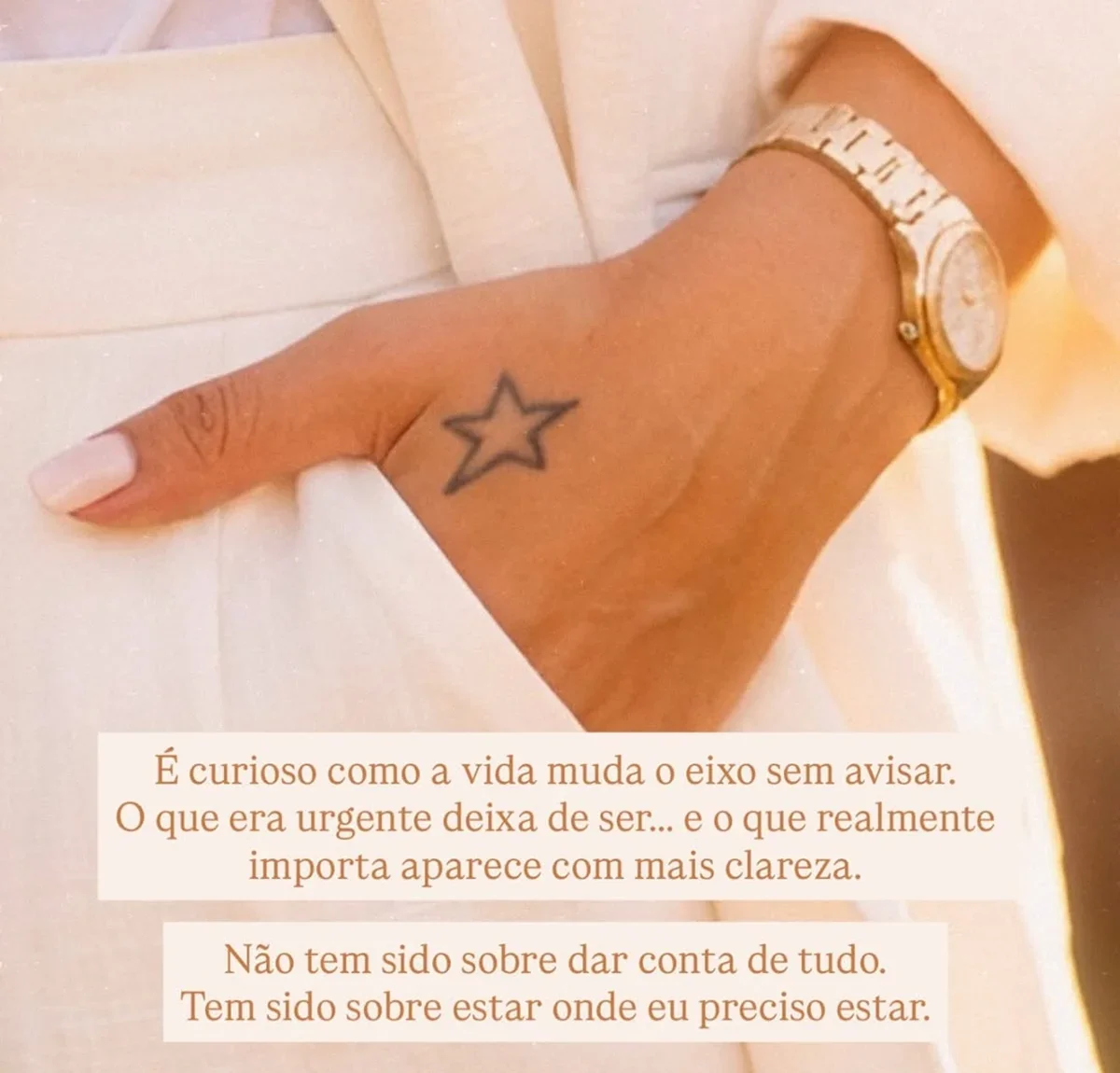 Na sequência, a cantora refletiu sobre as mudanças que algo assim provoca: “É curioso como a vida muda o eixo sem avisar. O que era urgente deixa de ser… e o que realmente importa aparece com mais clareza. Não tem sido sobre dar conta de tudo. Tem sido sobre estar onde preciso estar”, pontuou, antes de completar:
