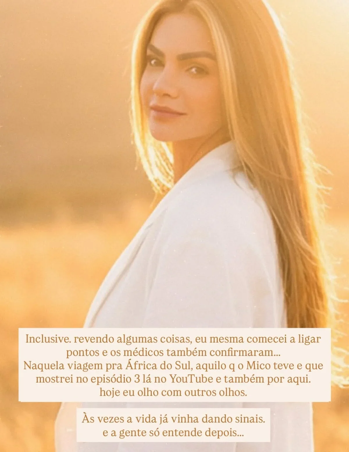 “Inclusive, revendo algumas coisas, eu mesma comecei a ligar pontos e os médicos também confirmaram… Naquela viagem para a África do Sul, aquilo que o Mico teve e que mostrei no episódio 3 lá no YouTube e também por aqui. Hoje eu olho com outros olhos. Às vezes, a vida já vinha dando sinais e a gente só entende depois”, encerrou.