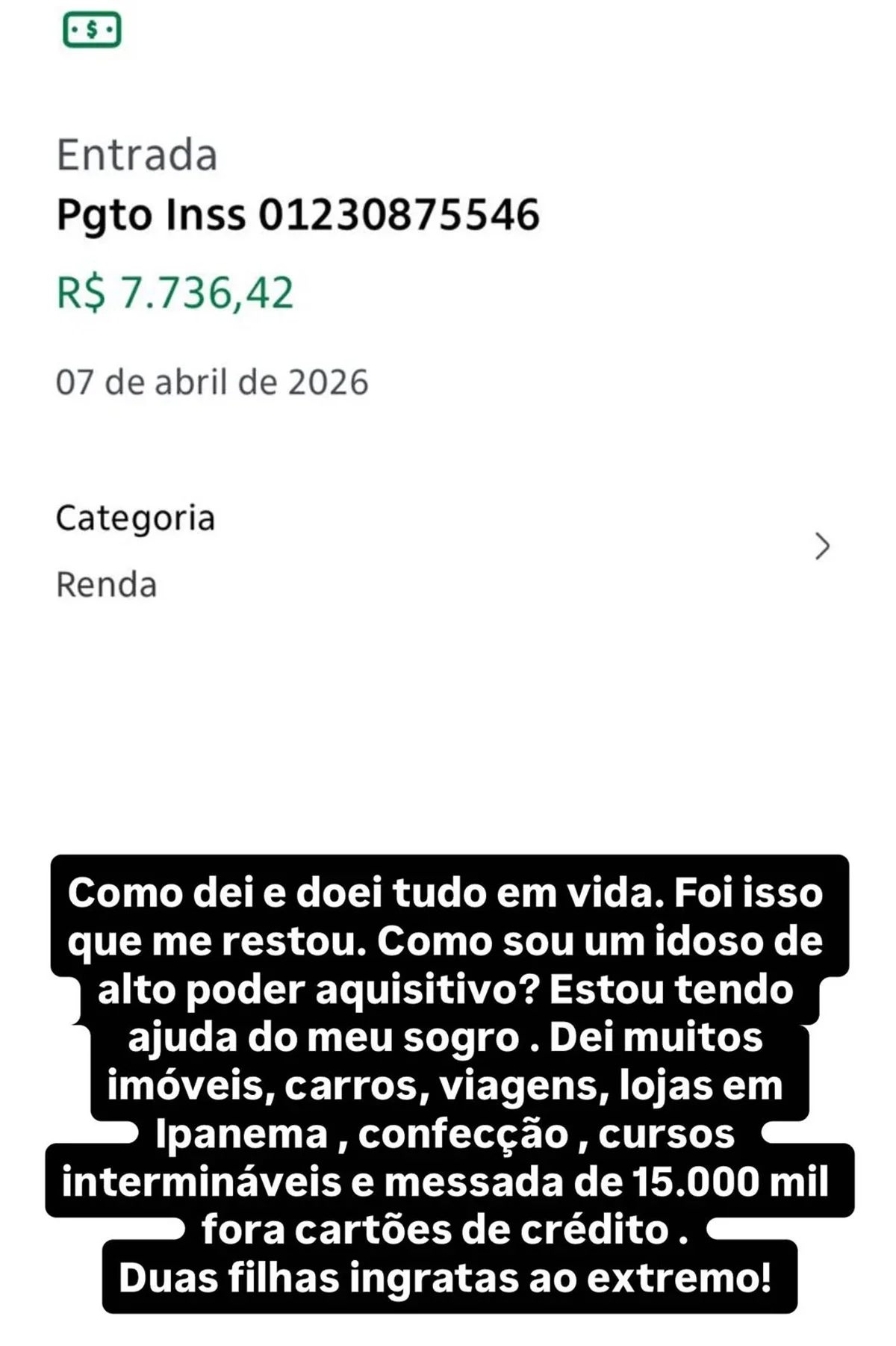Logo depois, Stênio Garcia mostrou um extrato bancário, com saldo de pouco mais de R$ 7,7 mil, e rebateu. “Como dei e doei tudo em vida, foi isso que me restou. Como sou um idoso de alto poder aquisitivo? Estou tendo ajuda do meu sogro. Dei muitos imóveis, carros, viagens, lojas em Ipanema, confecção, cursos intermináveis e mesada de R$ 15 mil, fora cartões de crédito. Duas filhas ingratas ao extremo!”, detonou.