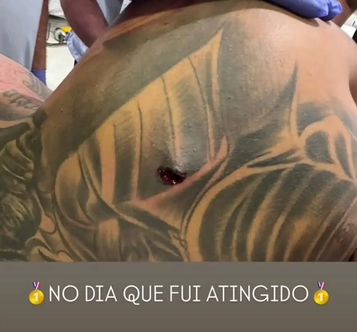 “NASCI DE NOVO”, AFIRMOU. Em seguida, ele continuou relatando: “Eu sou um ser humano, além de ser um cantor (entre aspas) como você fala. Eu tenho mãe, tenho família e tava trabalhando, é o meu trabalho. Isso aqui eu fui alvejado, eu nasci de novo. Isso aqui é um tiro”, mostrou.