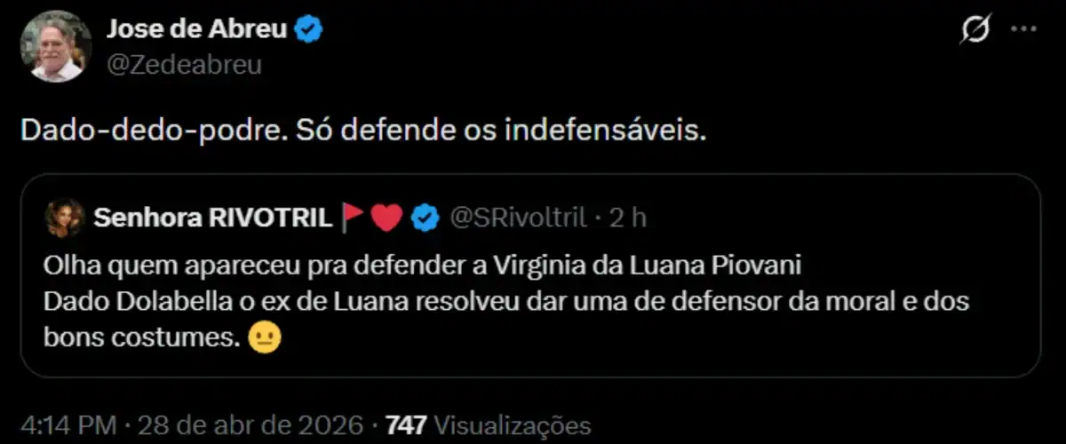 “Olha quem apareceu pra defender a Virginia da Luana Piovani: Dado Dolabella, o ex de Luana resolveu dar uma de defensor da moral e dos bons costumes”, dizia o post. Ao republicar a mensagem, José de Abreu acrescentou:
