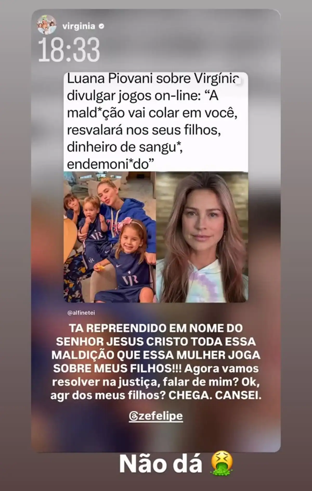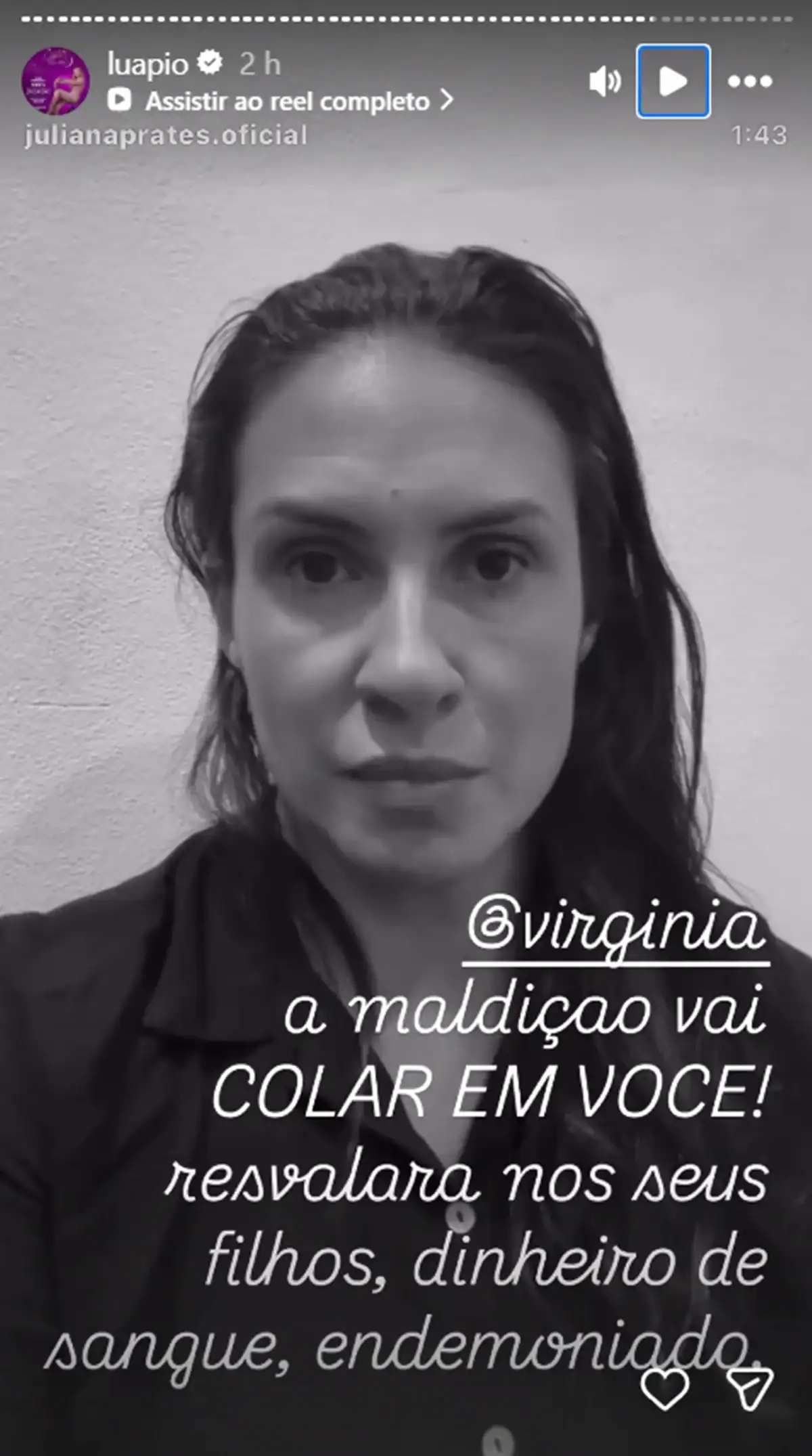Ao mostrar o sofrimento de Juliana, Luana Piovani citou Virginia Fonseca e escreveu: “Virginia, a maldição vai colar em você! Resvalará nos seus filhos, dinheiro de sangue, endemoniado”, detonou a artista.