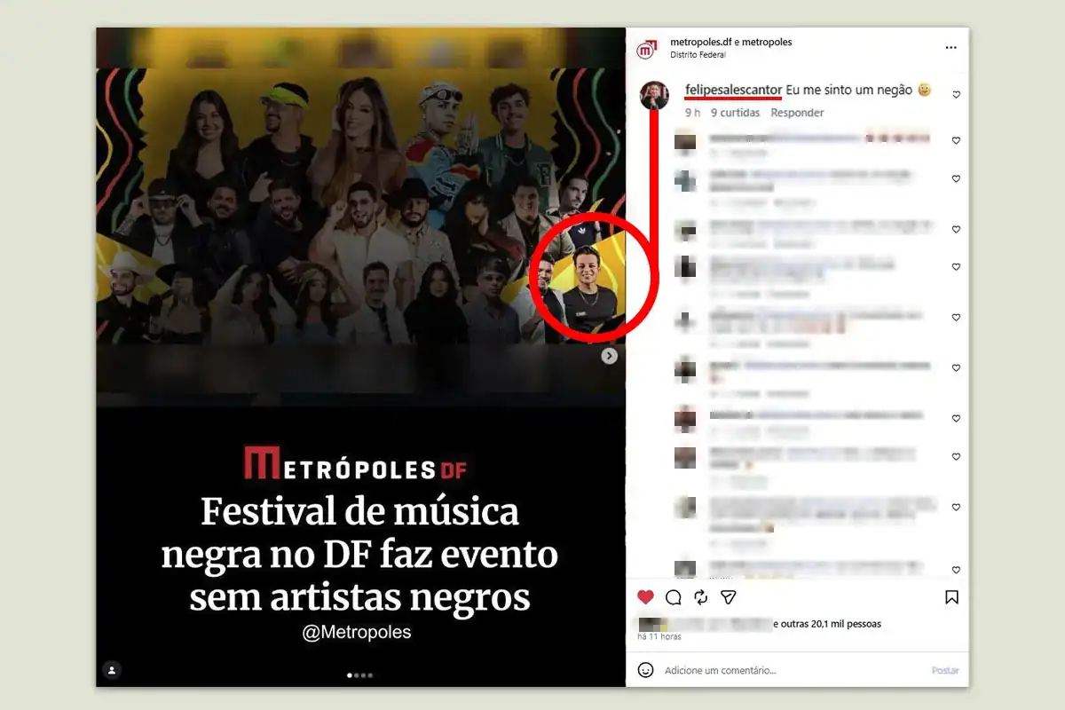Um dos artistas que participou do Festival Melodya, parte do Festival de Música Negra, fez piada sobre a ausência de artistas negros no evento. O cantor Felipe Sales ironizou a situação em meio a muitos comentários de artistas e ativistas negros do Distrito Federal e do Brasil.