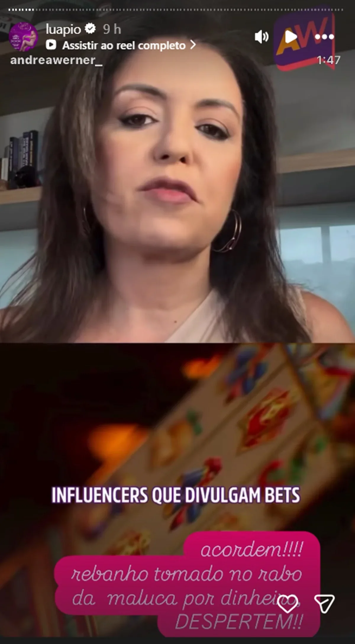 Nos stories do Instagram, Luana Piovani compartilhou um vídeo da deputada estadual Andrea Werner, de São Paulo. Na gravação, a parlamentar afirma que as plataformas de apostas deveriam ser proibidas no Brasil. “Na impossibilidade disso, que não seja permitido nenhum tipo de divulgação ou propaganda, assim como álcool ou cigarro, e isso inclui influencers”.